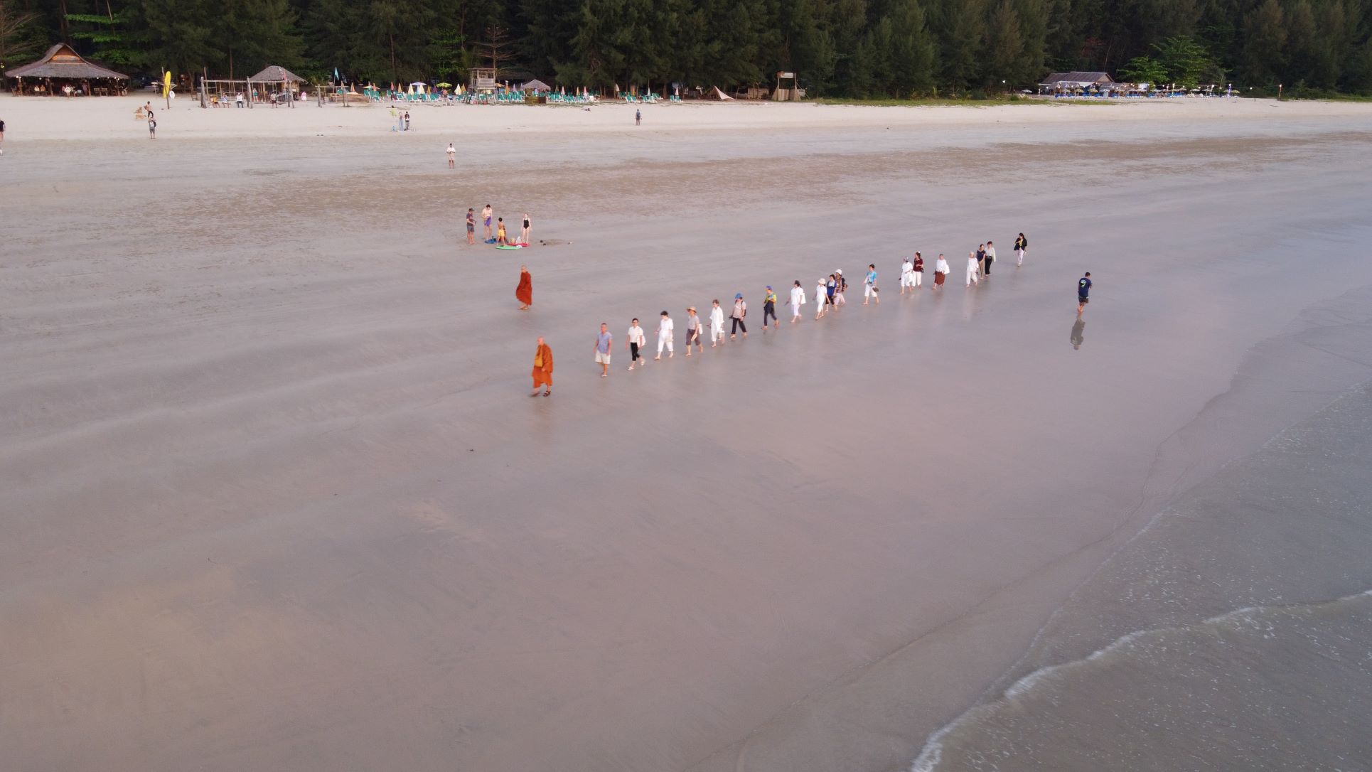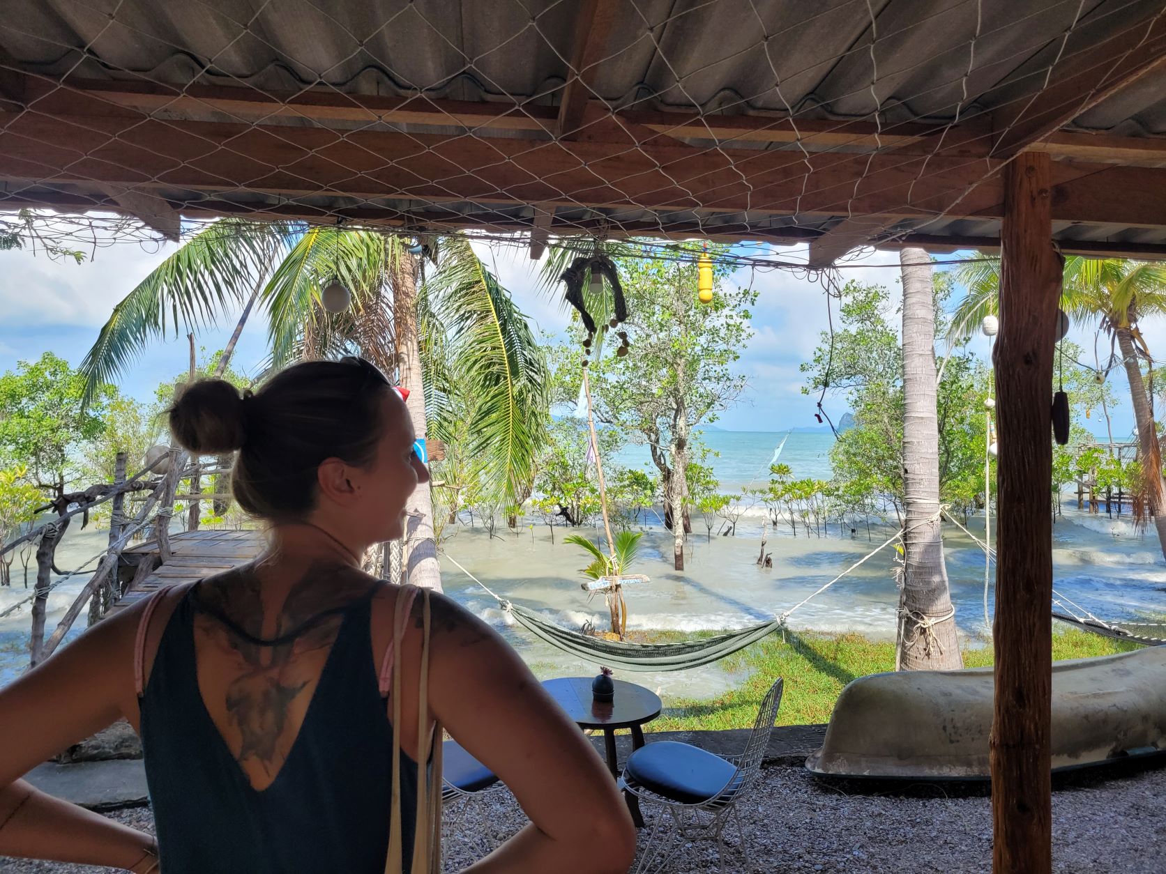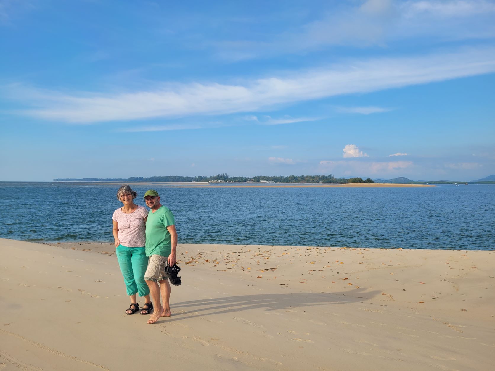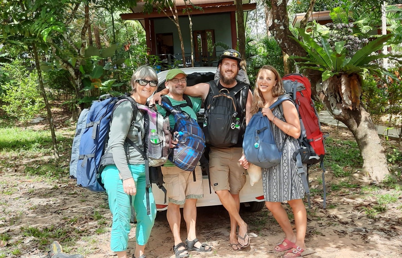 Die Reise geht jetzt weiter, mit Abschiedsfoto 4 Rucksäcke 🎒, Ziel ist das Dorf Ban Nam. Unterwegs füllen wir unseren Proviant noch auf, damit wir mit Frühstück, Trinken, Snacks gut versorgt sind. Über verschlungene Strassen erreichen wir den Ort, wir parkieren vor einem alten, unscheinbaren Haus. Freundlichst werden wir begrüsst, gelangen auf die Rückseite des Hauses, ein Paradies am See, Palmen, Terrasse, Natur rundum, der WOW-Effekt. Von hier aus spazieren wir bis an den Beach, es ist einfach umwerfend, sehr feiner, pudriger Sand, sehr flach, abends bei Ebbe sehr grosse Sandflächen, wunderschöne Sonnenuntergänge. Wir statten einen Besuch im lokalen Tsunami-Museum ab. Das ist absolut sehr eindrücklich, sehr gute Führung und Infos. Es ist fast nicht vorstellbar, was hier alles passiert ist. Es wurde sehr viel unternommen, um die Bewohner zukünftig rechtzeitig vor einem Tsunami zu warnen.