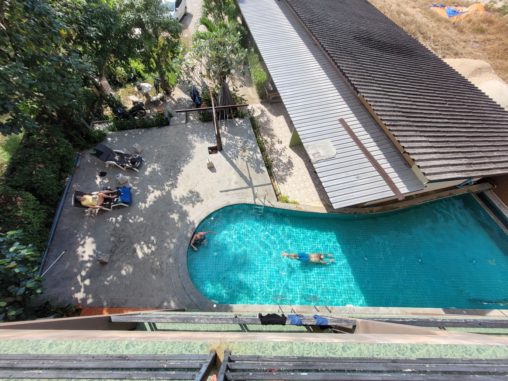 Nach einer Platzrunde am Küstenstreifen, schlängeln wir uns durch die abgelegenen Strassen und Gassen und erreichen das Ziel, das Suthawan Hotel Resort, eine kleine Oase etwas ausserhalb der Küste. Die Umgebung ist Palmengesäumt, ein kleiner seichter Pool garantiert angenehme Abkühlung. Die Zimmer im Erdgeschoss haben Zugang direkt zum Pool, also bitte Bier zweckmässig abstellen.