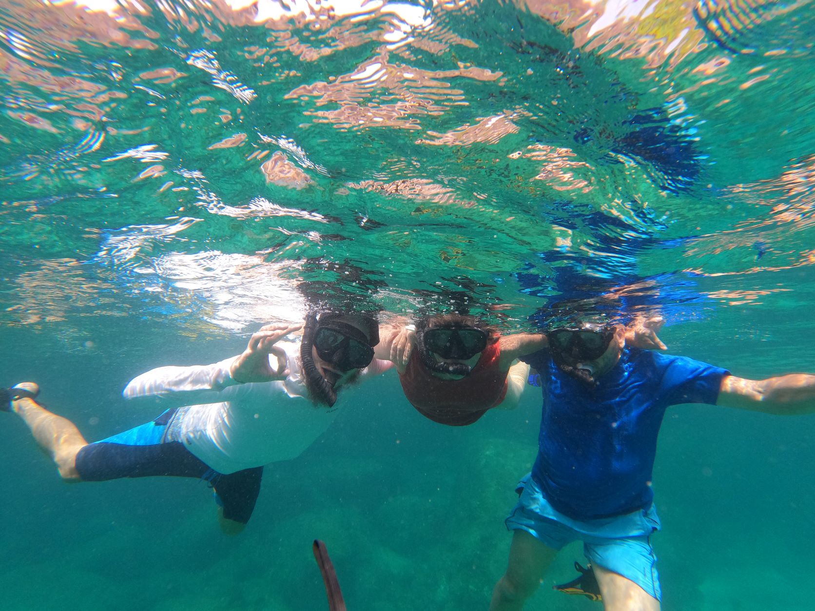Während des Tagesausflugs machten wir an verschiedenen Inseln halt und hatten diverse Male die Möglichkeit ausgiebig zu schnorcheln oder die Inseln zu erkunden. Das Inseln erkunden fiel bei uns jedoch immer ins Wasser, da das Schnorcheln einmalig und so fantastisch war. Das Wasser war glasklar und gab einem freie Sicht auf die nächsten 30 Meter. Nach dem Eintauchen war man von Fischen umgeben und fühlte sich wie in einem nie endenden Aquarium. Die Fische in allen Grössen und Farben waren umgeben von türkisgrünen Meer, Sonnenstrahlen, die durch die flache Wasseroberfläche drangen und Korallen mit weiteren Unterwassertieren. Ein unvergessliches Erlebnis. In den Pausen wurden wir mit Früchten und auf der einen Insel mit einem ausgiebigen Mittagessen versorgt. Auch für ausreichend kühle Getränke war gesorgt. Über den Tag verteilt waren wir ca. 4.5h am Schnorcheln. Klingt nach sehr langer Schnorchelzeit, fühlte sich jedoch nicht so an. Die Zeit verflog und wir befanden uns bereits wieder mit höchstgeschwindigkeit auf dem Rückweg. Ein letzter Spritzer Wasser, der übers Boot schwappt, und schon waren wir zurück beim Hafen und fanden uns in der grossen Halle mit allen Touristen wieder. War das nun alles geschehen? So viele Bilder im Kopf und so viel zu verarbeiten, man kommt sich vor als wäre man gerade aus einem Traum erwacht. Die Bilder in unseren Köpfen sind jedoch unvergesslich und wir werden uns immer daran erinnern.