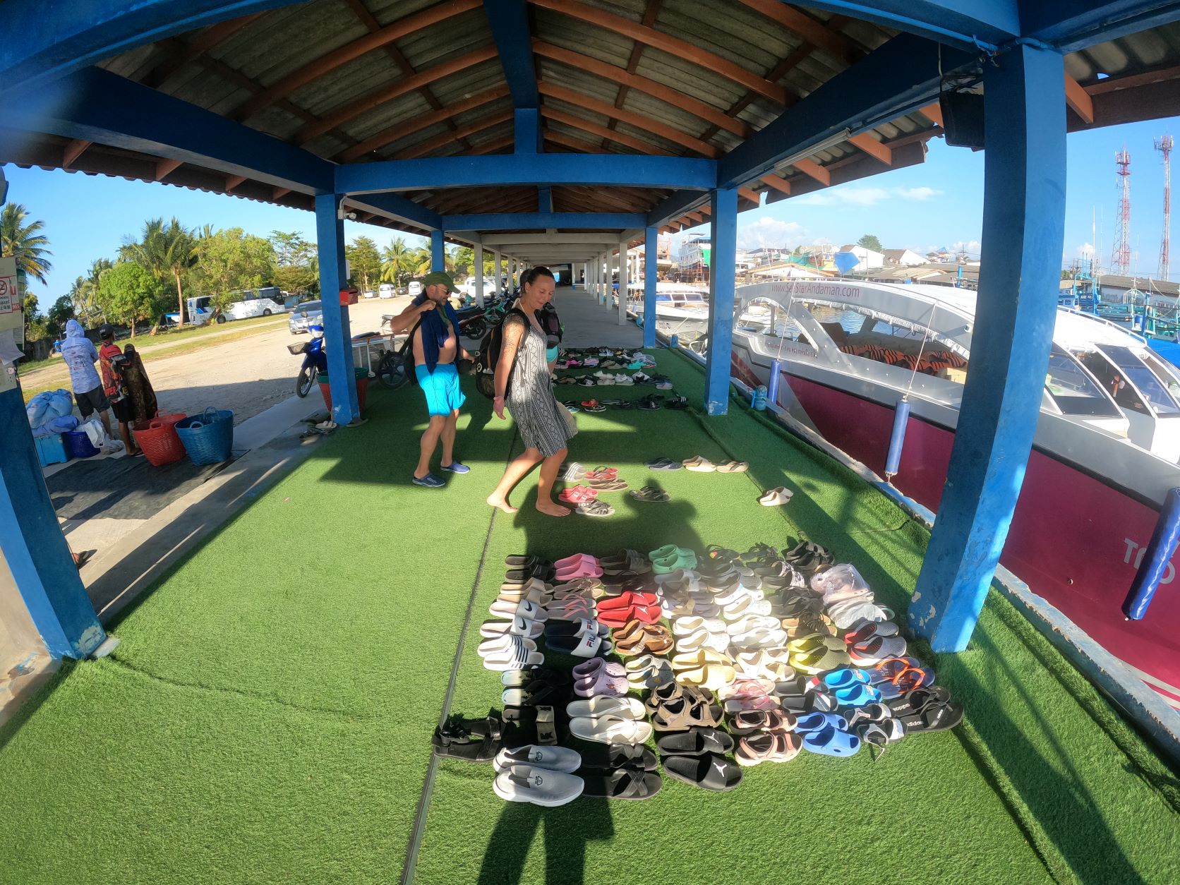Wir reisten selbständig mit unserem Mietauto zum Hafen. In einer grossen Halle wurden wir vom Personal empfangen. Nach dem "Check-In" gab's ein kostenloses Frühstücksbuffet. Vor der Halle stoppten im Minutentakt Minibusse, welche mit Menschen gefüllt waren. Die Halle mit dem Frühstücksbuffet füllte sich zusehends. Mit diversen Megafonen verkündete das Personal lautstark, dass die gebuchten Touren nun beginnen. Gemäss unseren farbigen Armbändern schlossen wir uns unserem Grüppchen an. Zum Glück hatten wir ein kleineres Boot gebucht! Nach einer kurzen Information vom Tourguide huschten wir rasch an allen anderen vorbei auf das Boot. Wir sicherten uns die hintersten Plätze auf dem Boot, da der Bug in der Regel weniger stark auf Wellengang reagiert. Diese Annahme bewährte sich während der rasanten Fahrt. Die Gesichter der anderen Passagiere, welche weiter vorne auf dem Boot sassen, wirkten leicht gequält. Was wir allerdings nicht beachtet hatten, der Wellengang mag wohl nicht stark zu spüren sein, jedoch war dies mit Abstand der feuchteste Platz auf dem Boot. Nach wenigen Minuten waren Marco's Eltern bis zu den Badehosen durchnässt. Netterweise wurde ihnen vom Personal Handtücher ausgehändigt. Nach der 1.5 stündigen Bootsfahrt, waren auch die Handtücher klatschnass. Unser strapaziertes Grüppchen wurde jedoch bei der Ankunft auf der ersten Insel belohnt!
